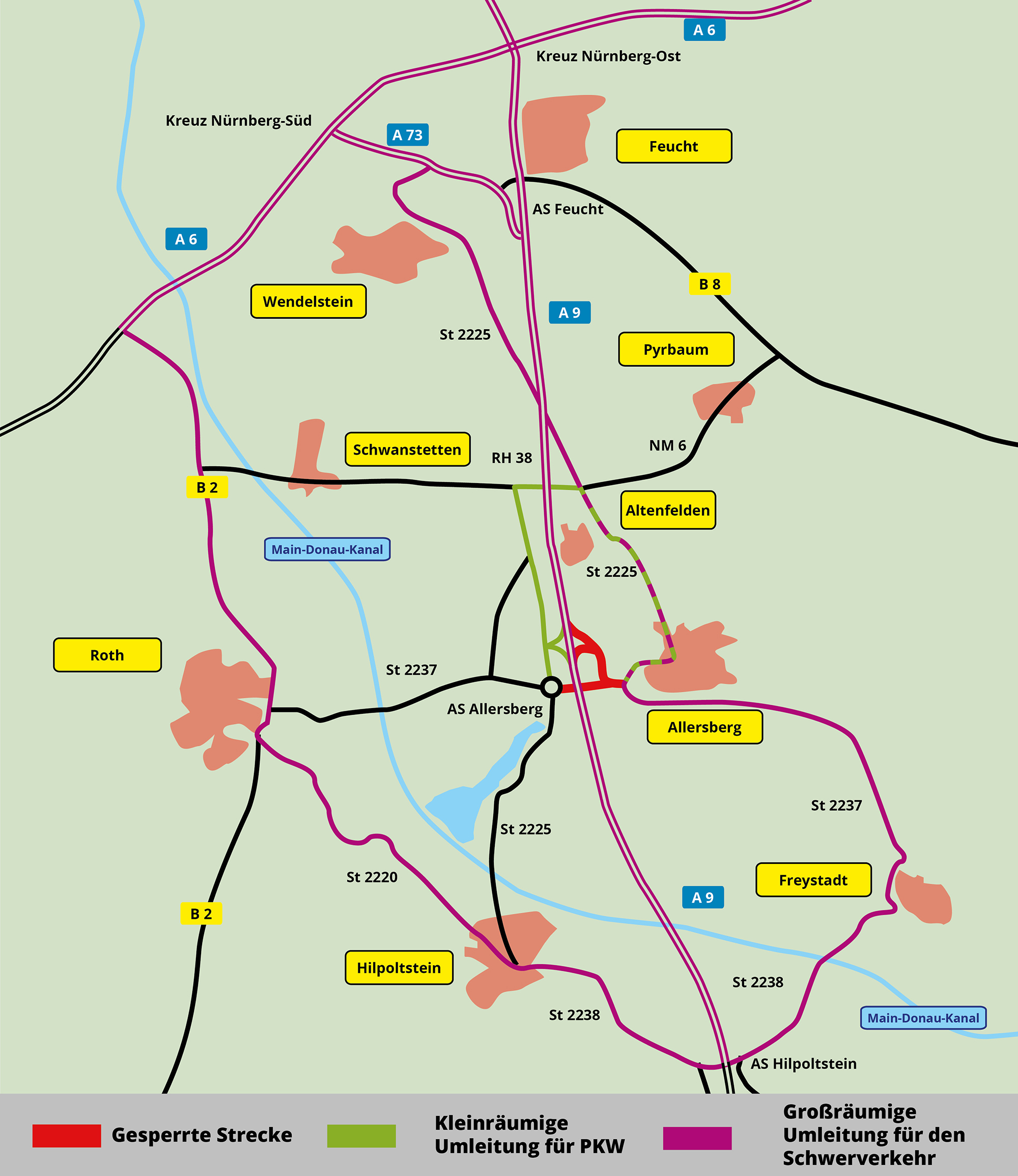Sowohl für den lokalen PKW-Verkehr im Bereich Allersberg als auch für den regionalen Schwerverkehr zwischen Feucht und Greding gibt es Ausweichrouten.